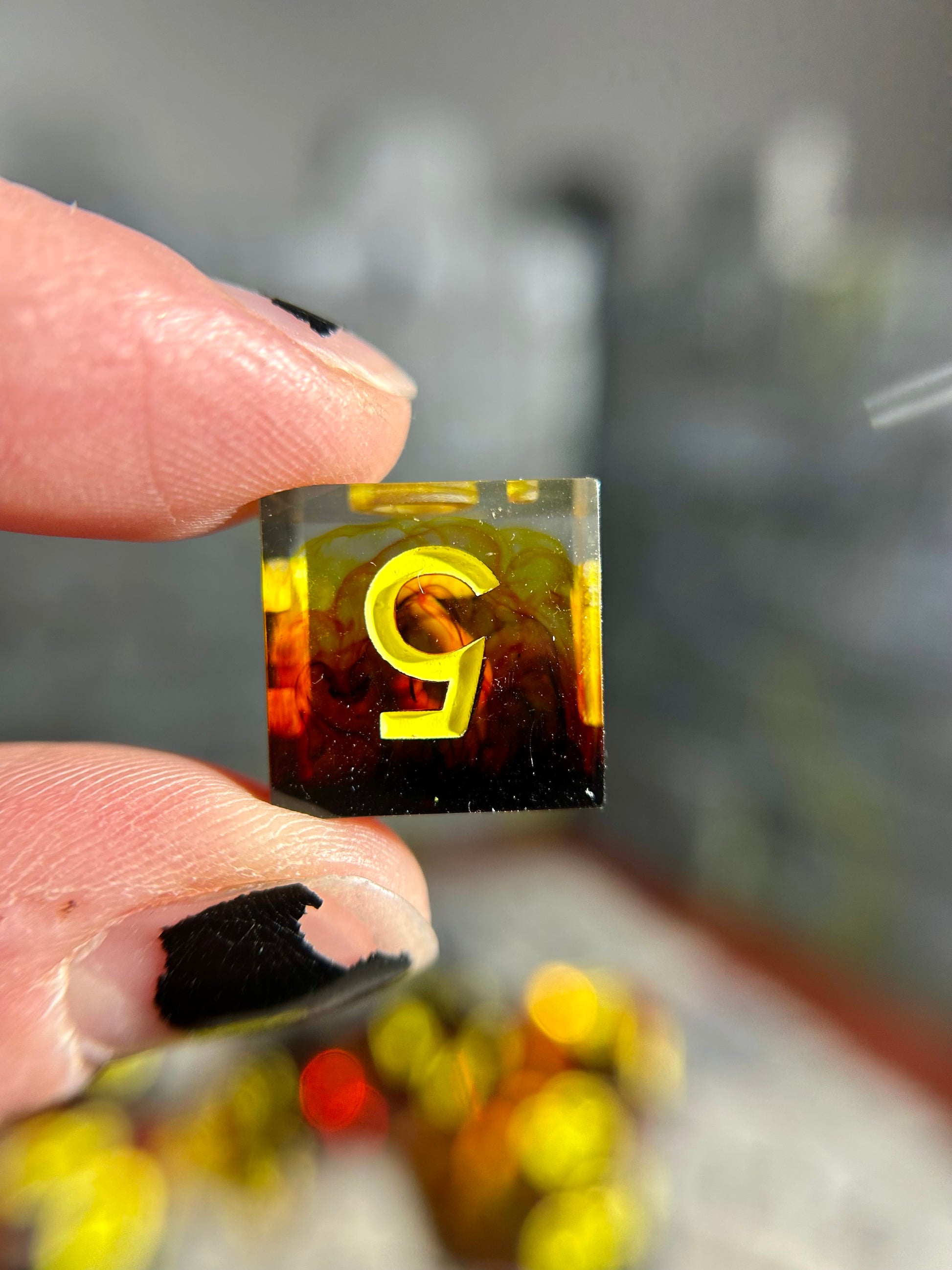 Due to the nature of handcrafted items, dice may contain small blemishes, scratches, or imperfections - we like to call these "maker's marks." These imperfections will not affect the balance or result of the dice in any way.