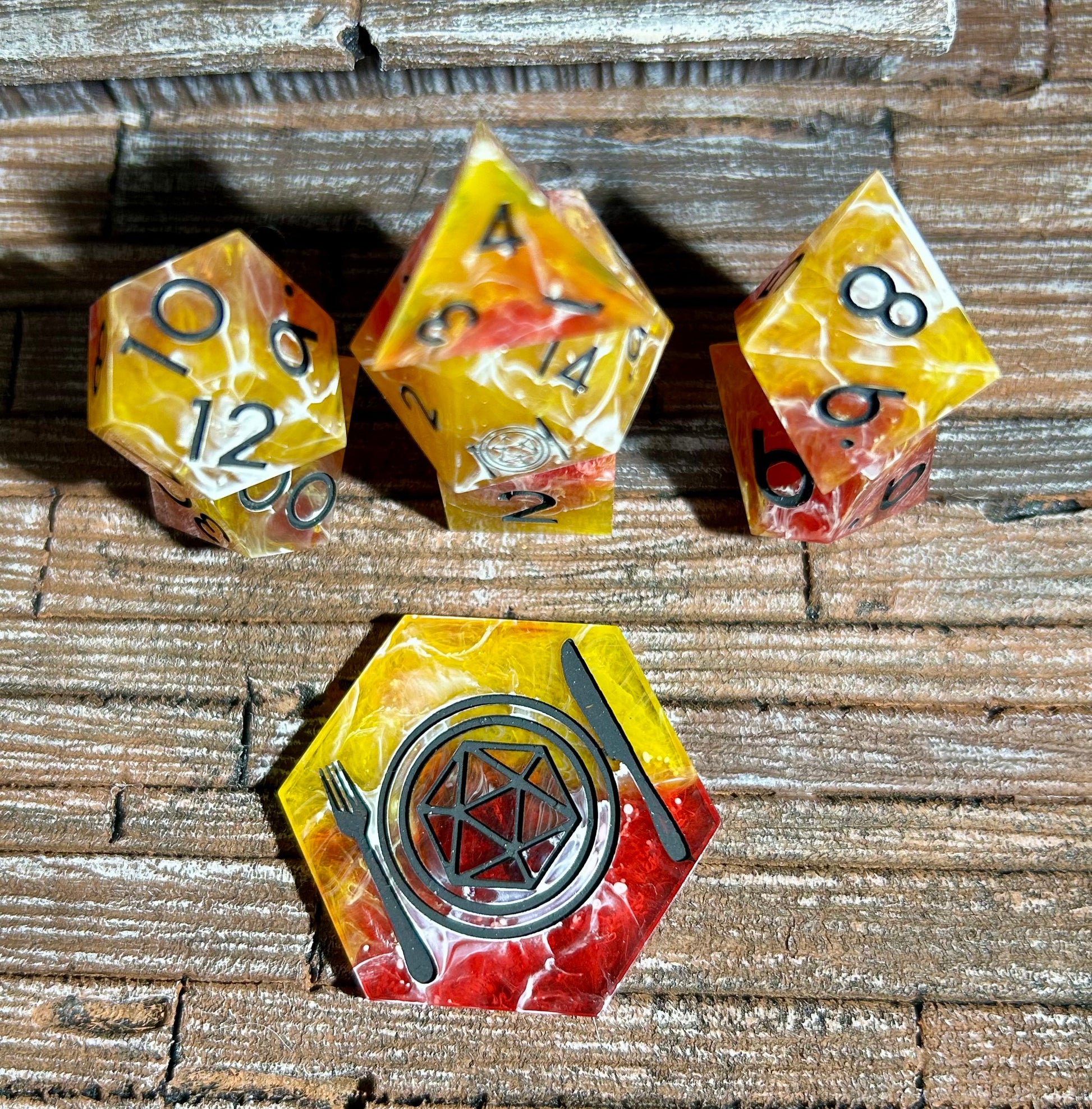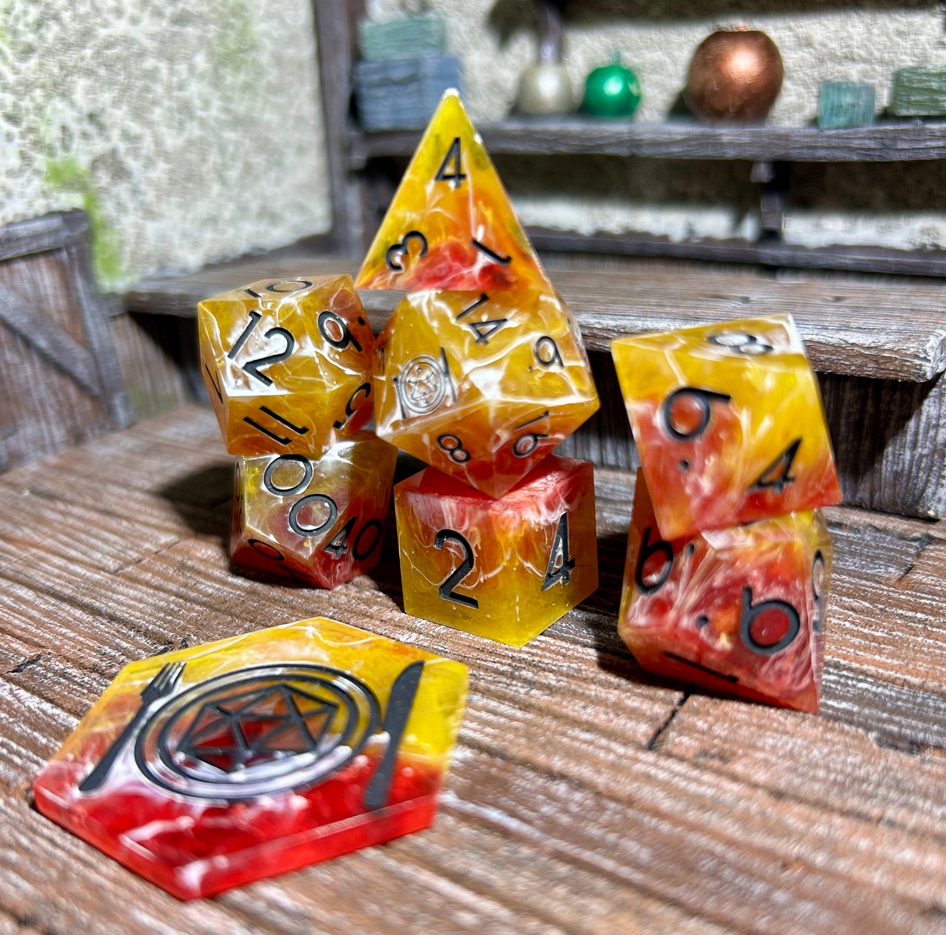 Handcrafted 8-piece polyhedral dice set. The dice are made with resin and the numbers are painted with acrylic paint.
