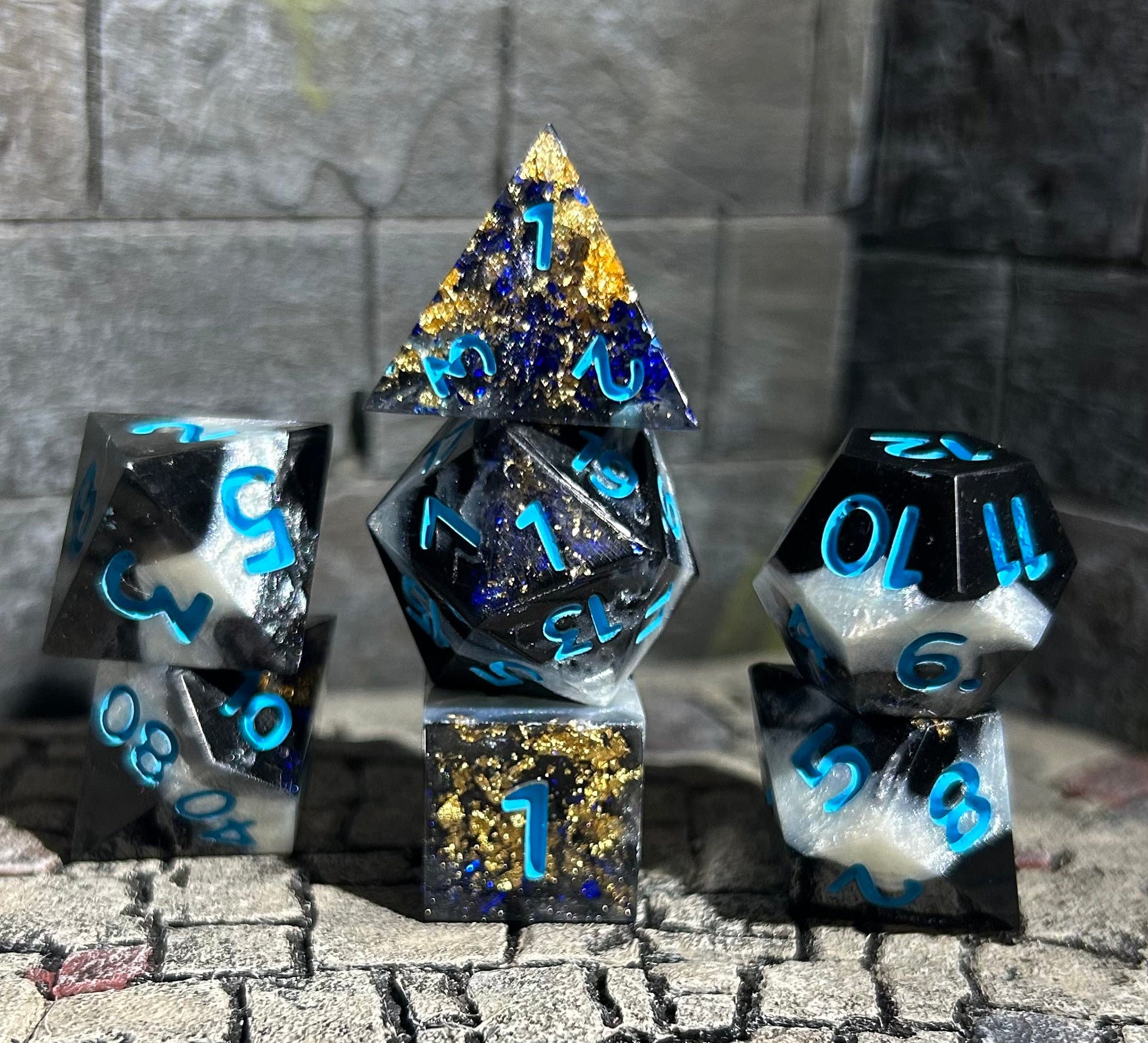 Handcrafted 7-piece polyhedral dice set. The dice are made with resin and the numbers are painted with acrylic paint. This set has a frosted finish rather than glassy.